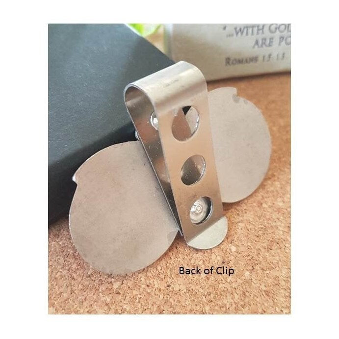 This Visor Clip is made of high quality pewter with clear image of St Benedict and letters and initials representing the cross . This Clip has a strong metal clip on the back to allow secure attachment to the visor in your vehicle. You can also clip it onto Glasses Storage area as pictured.
