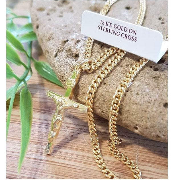 Mens Gold On Sterling Silver Crucifix/Classic Crucifix Necklace/Gold Plated On Sterling Crucifix Pendant/Crucifix Cross with Heavy Chain