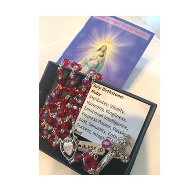 Ruby Birthstone Rosary, July Birthstone Rosary In Red Ruby with Birthstone Attributes Tag & How to Pray the Rosary Booklet Set, Sacred Heart