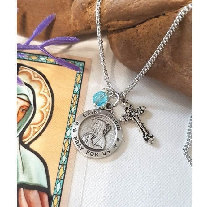 This is a Quality Pewter Medal of Saint Brigid of Kildare or Brigid of Ireland with Birthstone Glass Charm and Little Pewter Crucifix on Strong and durable Rhodium plated Curb Chain.