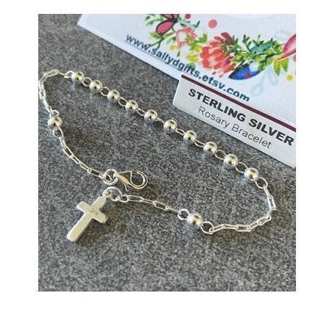 Dainty, simple and sweet Practical First Communion and Confirmation Gifts for Girls. This Sterling Silver Rosary Bracelet is made with all Sterling Silver Elements from the Paperclip style links, Cross and ball beads.